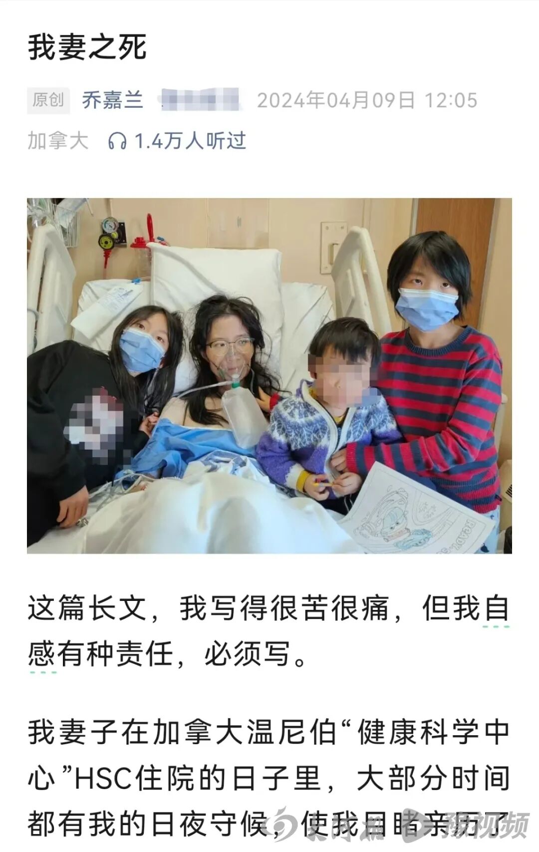 大河报消息,2024年4月,一篇《我妻之死》长文在网络上引发巨大关注。作者乔嘉兰以近两万字长文,记录了结婚13年的妻子张敏在加拿大从确诊肺腺癌到20天后病逝的过程。在文章中,乔嘉兰对妻子在加拿大就医过程提出了质疑。