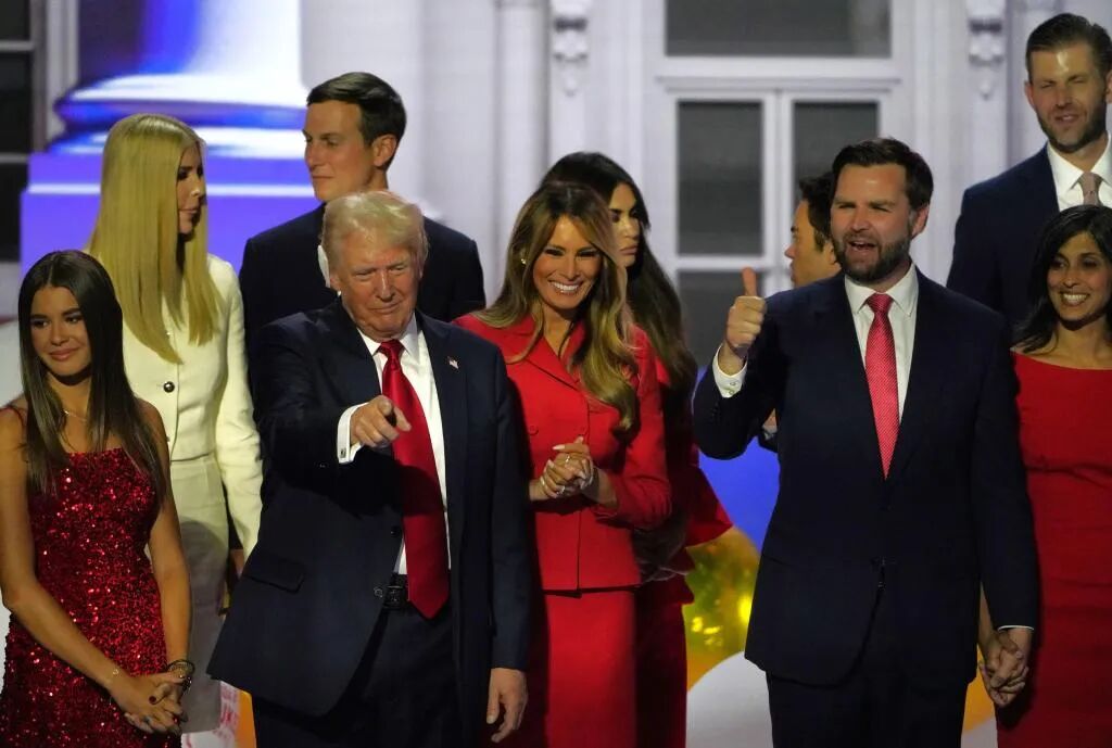 7月18日,美国前总统特朗普和共和党副总统候选人万斯在共和党全国代表大会上向观众致意。记者 吴晓凌 摄/新华社