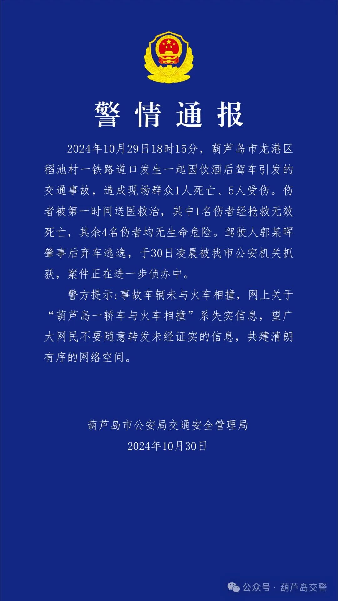 10月30日晚上,葫芦岛交警发出警情通报,10月29日18时15分,葫芦岛市龙港区稻池村一铁路道口发生一起因饮酒后驾车引发的交通事故,造成现场群众1人死亡、5人受伤。伤者被第一时间送医救治,其中1名伤者经抢救无效死亡,其余4名伤者均无生命危险。驾驶人郭某晖肇事后弃车逃逸,于30日凌晨被我市公安机关抓获,案件正在进一步侦办中。