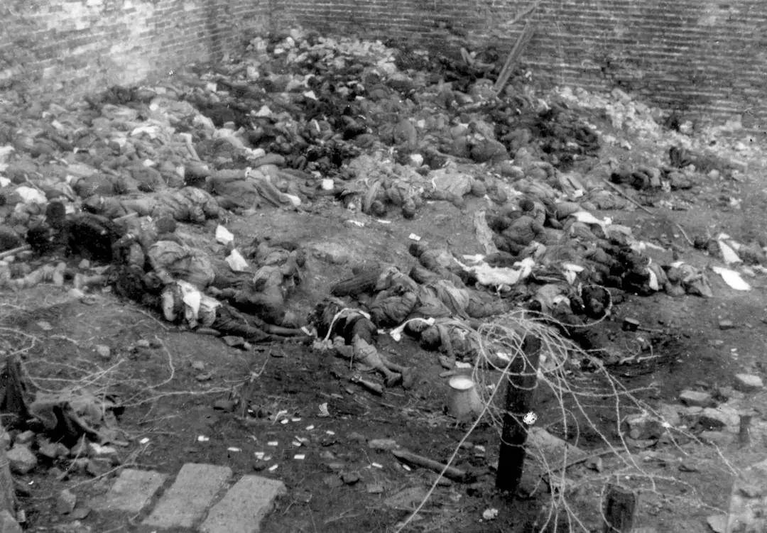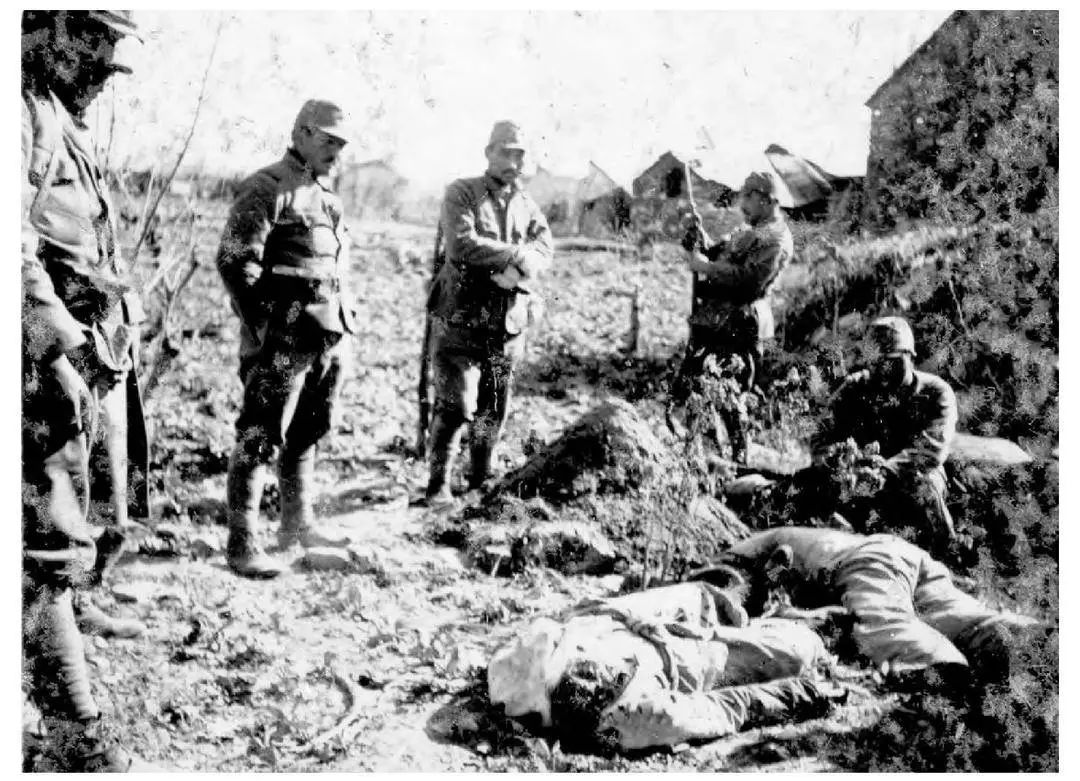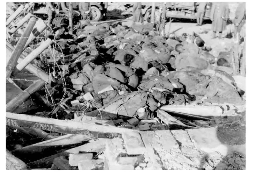 还有屠杀不久的场面,日军站在周围,被杀者身着军服,剃了光头。在城墙一角集体屠杀的场景,尸体也是双手被反绑。作为南京事件屠杀现场的照片,具有重要的史料价值。
